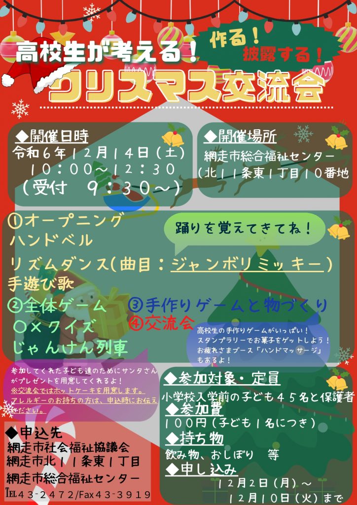 市内の高校生が地域の子ども達を対象にしたクリスマス交流会を企画しました。当日はハンドベルの演奏やリズムダンス・手作りゲームなど盛り沢山な内容です♪お申込みお待ちしております!!