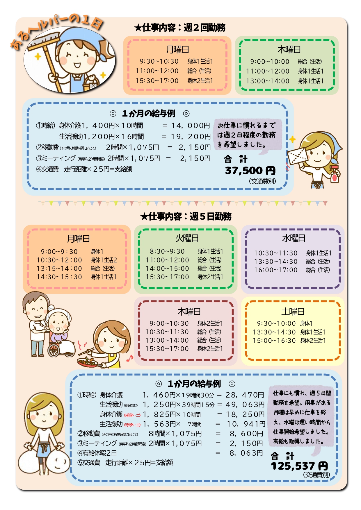 | 時給 | 身体介護1,400円~ 生活援助1,200円〜 (研修期間のみ1,075円) |